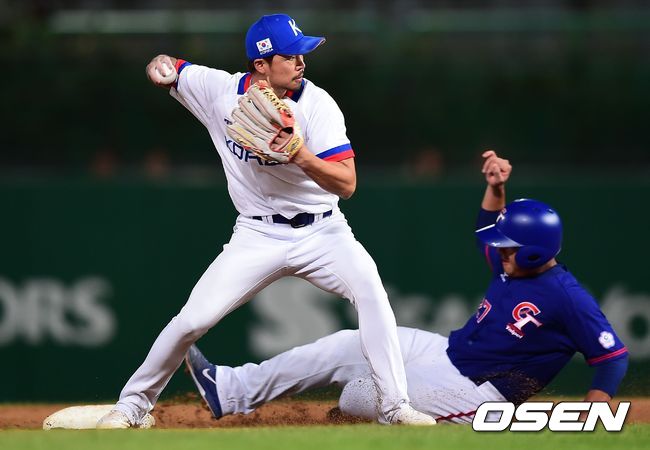 24일 문학야구장에서 벌어진 2014 인천 아시안게임 B조 예선 2차전 한국과 대만의 경기,5회초 1사 대만 린쿤셩의 병살타때 오재원 2루수가 1루 주자 주리런을 포스아웃시키고 1루로 송구하고 있다