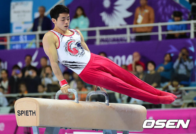 24일 오후 인천 남동체육관에서 열린 2014 인천 아시안게임 기계체조 남자 안마에서 박민수가 경기를 펼치고 있다.