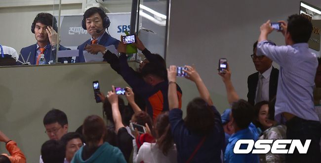 24일 문학야구장에서 벌어진 2014 인천 아시안게임 B조 예선 2차전 한국과 대만의 경기,해설 맡은 박찬호가 팬들의 카메라를 응시하고 있다