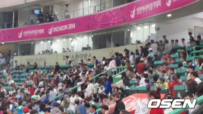 아시안게임 야구 경기를 보러온 관중들이 그라운드 대신 방송 중계석에 몰렸다.