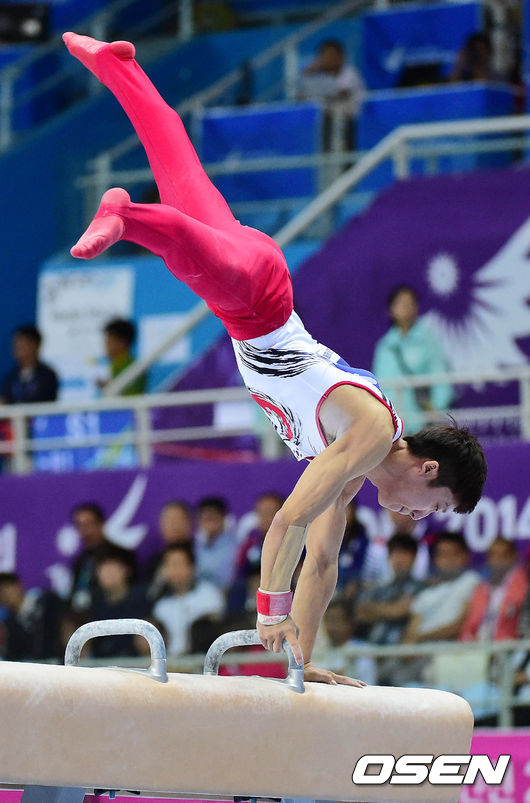 24일 오후 인천 남동체육관에서 열린 2014 인천 아시안게임 기계체조 남자 안마에서 신동현이 연기를 펼치고 있다.