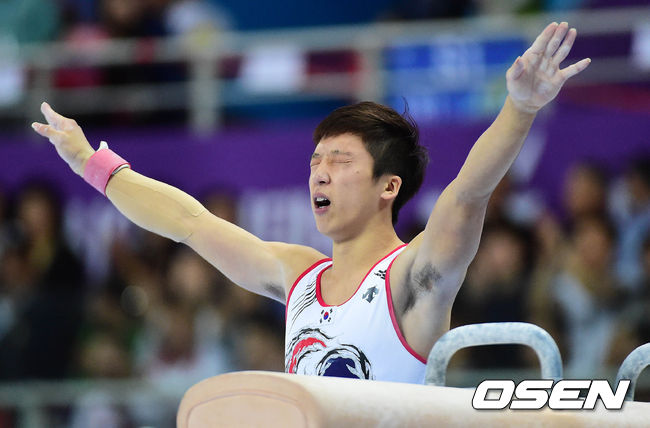 24일 오후 인천 남동체육관에서 열린 2014 인천 아시안게임 기계체조 남자 안마에서 신동현이 연기를 마치고 마무리를 하고 있다.