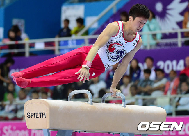 24일 오후 인천 남동체육관에서 열린 2014 인천 아시안게임 기계체조 남자 안마에서 신동현이 연기를 펼치고 있다.