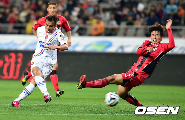 24일 오후 서울월드컵경기장에서 열린 '현대오일뱅크 K리그 클래식 2014' FC 서울과 경남 FC의 경기 후반, 경남 진경선이 슈팅을 시도하고 있다.