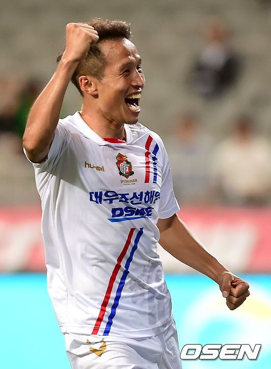 24일 오후 서울월드컵경기장에서 열린 '현대오일뱅크 K리그 클래식 2014' FC 서울과 경남 FC의 경기 후반, 경남 진경선이 선취골을 넣은 뒤 기뻐하고 있다.