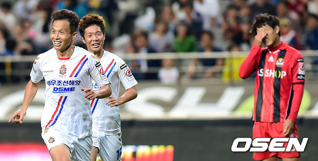 24일 오후 서울월드컵경기장에서 열린 '현대오일뱅크 K리그 클래식 2014' FC 서울과 경남 FC의 경기 후반, 경남 진경선이 선취골을 넣은 뒤 기뻐하고 있다.