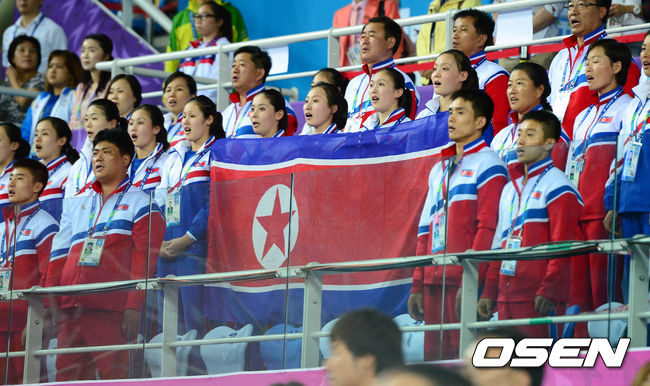 24일 오후 인천 남동체육관에서 열린 2014 인천 아시안게임 기계체조 여자 도마 시상식에서 북한 국가가 울려 퍼지자 관중석에 있던 선수단이 국가를 따라 부르고 있다.