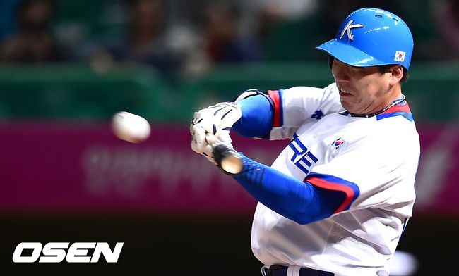 24일 문학야구장에서 벌어진 2014 인천 아시안게임 B조 예선 2차전 한국과 대만의 경기, 8회말 김현수가 13구 끝에 안타를 날리고 있다.