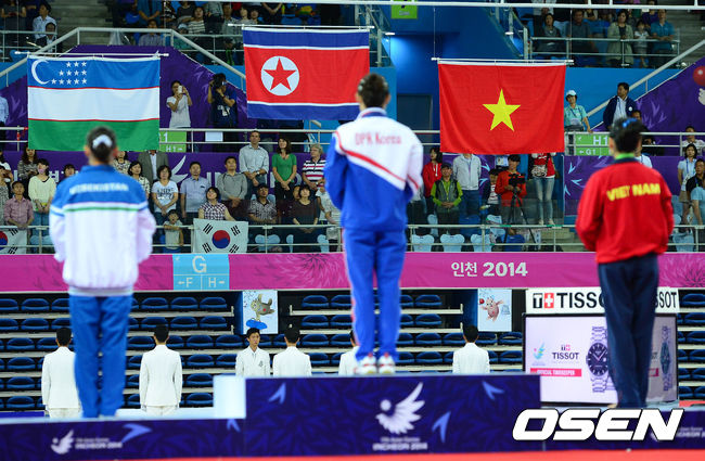 24일 오후 인천 남동체육관에서 열린 2014 인천 아시안게임 기계체조 여자 도마 시상식에서 금메달을 차지한 홍은정이 인공기를 바라보고 있다.
