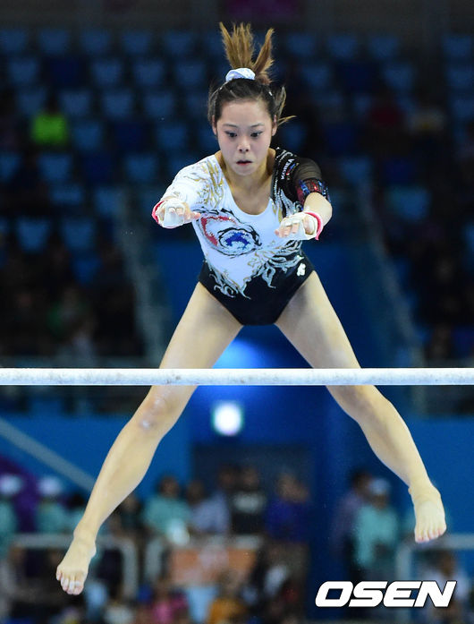 24일 오후 인천 남동체육관에서 열린 2014 인천 아시안게임 기계체조 여자 이단평행봉에서 엄다연이 연기를 펼치고 있다.