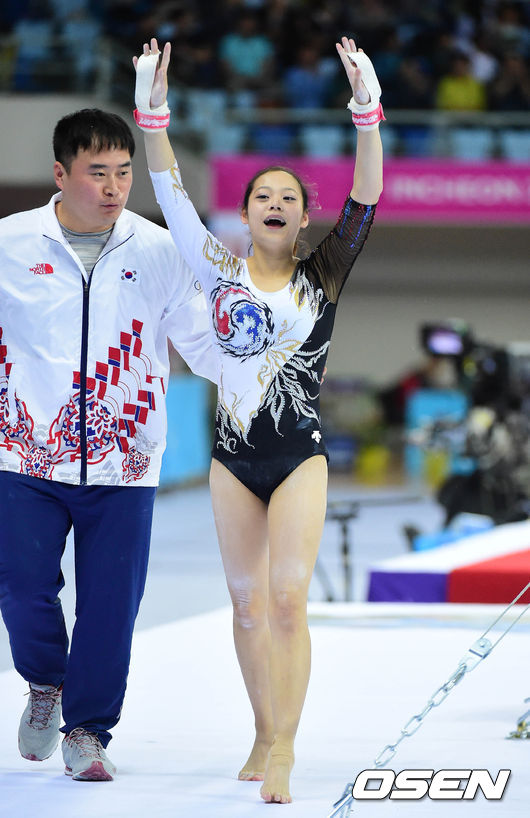 24일 오후 인천 남동체육관에서 열린 2014 인천 아시안게임 기계체조 여자 이단평행봉에서 엄다연이 연기를 마치고 손을 흔들고 있다.