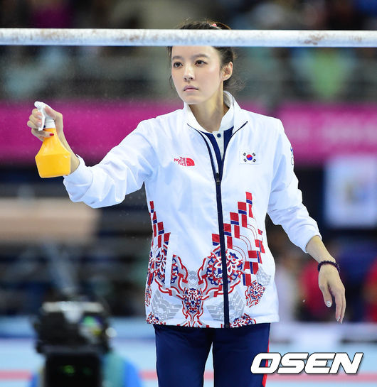 24일 오후 인천 남동체육관에서 열린 2014 인천 아시안게임 기계체조 여자 이단평행봉에서 한국 코칭스텝이 평행봉을 손질하고 있다.