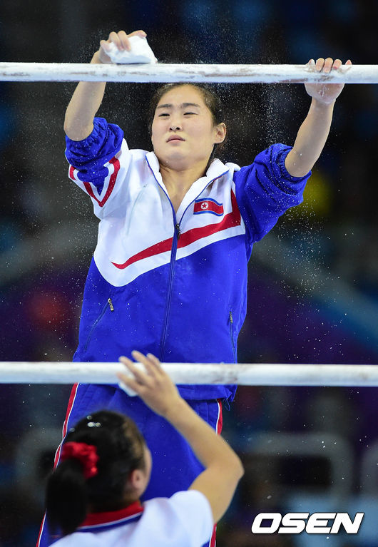 24일 오후 인천 남동체육관에서 열린 2014 인천 아시안게임 기계체조 여자 이단평행봉에서 홍은정이 동료 강용미를 위해 평행봉을 손질하고 있다.