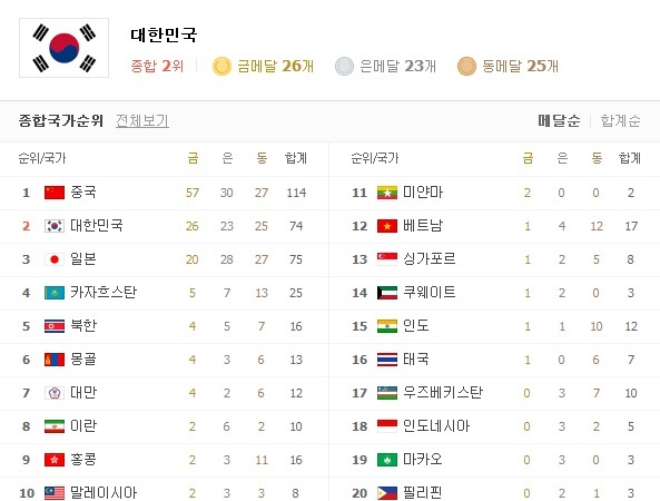 한국은 금메달 26개, 은메달 23개, 동메달 25개 총 74개의 메달로 2위에 안착해 있으며 중국은 금메달 57개, 은메달 30개, 동메달 27개 총 1147개의 메달로 아시안게임 메달순위 1위에 올라있다.