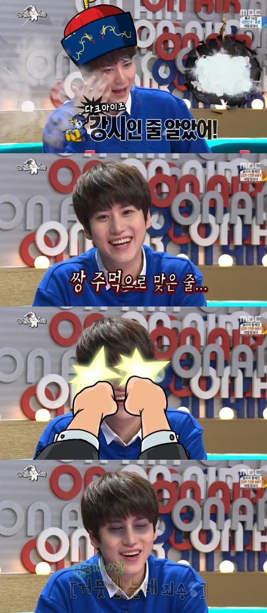 이에 윤종신은 “강시인줄 알았어. 쌍주먹으로 맞은 줄 알았어”라고 깐족거렸다. 규현은 “무대에 오르느라 화장을 했는데 지울 시간이 없었다”고 해명, “차태현 씨 외에는 그냥 일반인 같다”라고 이날 출연자들을 소개해 웃음을 자아냈다.