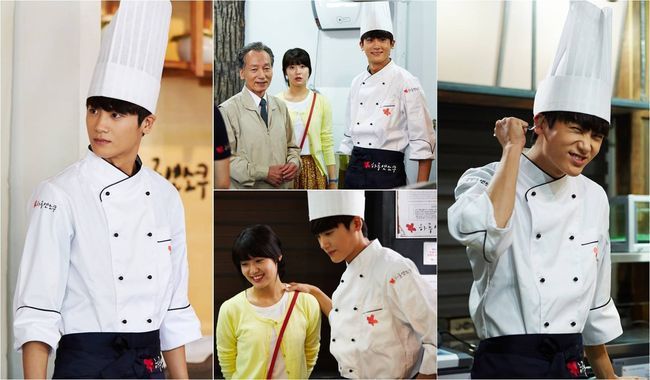 주방장 모자와 각 잡힌 자세로 빈틈없이 완벽한 주방장으로 변신한 모습, 또 포크를 들고 머리를 긁적이고 있는 깜찍이 주방장의 매력이 드러났다.