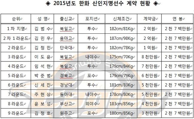 한화는 25일 2015년 신인 지명선수 10명과 계약을 완료했다고 밝혔다. 1차 지명한 북일고 좌완 김범수, 2차 1라운드 전체 1순위로 뽑은 용마고 우완 김민우 선수와 각각 계약금 2억원, 연봉 2700만원에 계약을 체결했다.