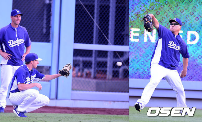 경기에 앞서 다저스 류현진이 그라운드 피칭을 하고 있다.