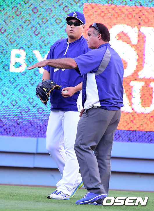 경기에 앞서 다저스 류현진이 트레이너와 이야기를 나누고 있다.