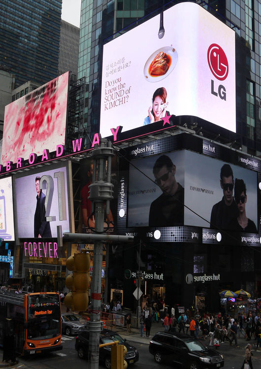 LG전자는 현지 시간 24일 뉴욕 타임스스퀘어에서 대형 전광판을 통해 한국의 대표적인 식품인 김치의 우수성과 김치를 전용냉장고에 보관하는 한국의 문화를 알리는 영상을 상영했다. 65초 분량의 이 영상은 타임스스퀘어가 항상 관광객으로 붐비는 장소인 것을 감안해 한글과 영문 자막으로 제작했다.