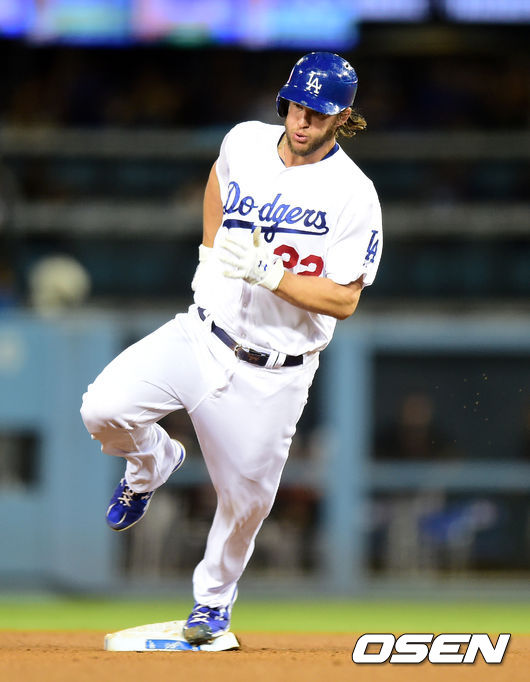 5회말 2사 3루에서 다저스 커쇼가 1타점 동점 적시 3루타를 날리고 전력질주하고 있다.