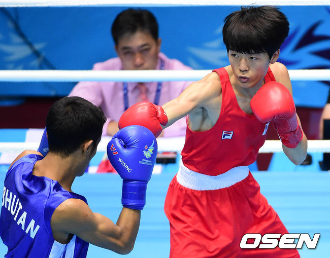 25일 오후 인천 선학체육관에서 열린 2014 인천 아시안게임 복싱 남자 플라이급(52kg) 32강전에서 한국 최상돈이 부탄 곌트쉔(Gyeltshen Kinley)과 경기를 펼치고 있다.