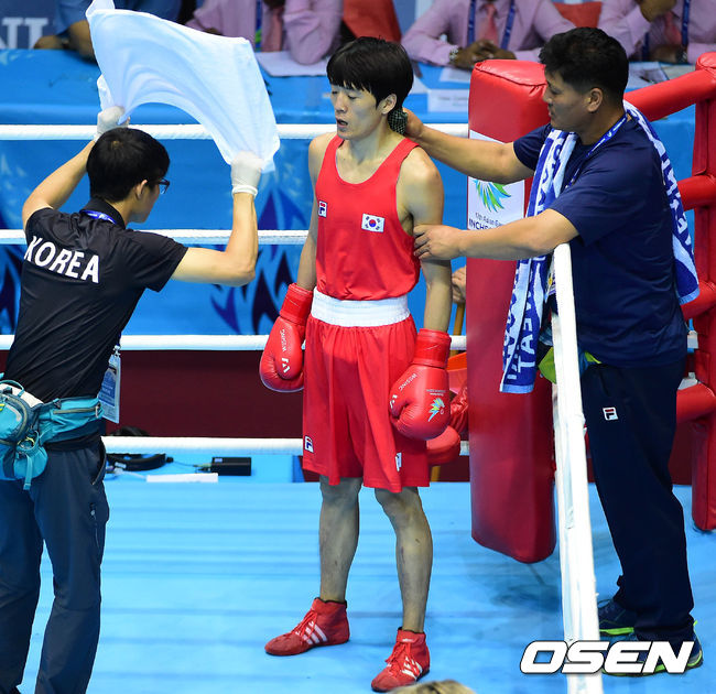 25일 오후 인천 선학체육관에서 열린 2014 인천 아시안게임 복싱 남자 플라이급(52kg) 32강전에서 한국 최상돈이 1라운드 종료 후 브레이크 타임을 갖고 있다.