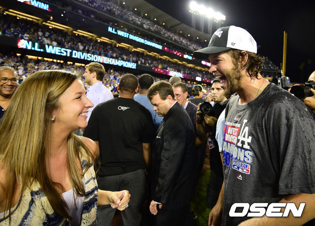 커쇼가 아내 엘렌 커쇼와 우승을 기뻐하고 있다. /jpnews@osen.co.kr