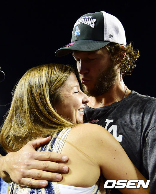 커쇼가 아내 엘렌 커쇼에 키스를 하며 우승 세리머니를 하고 있다. /jpnews@osen.co.kr