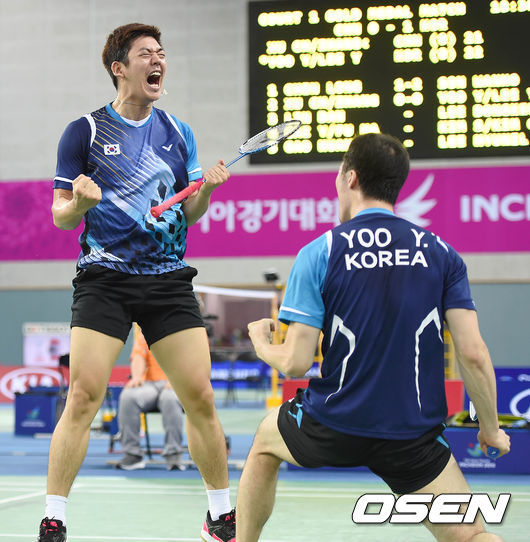 한국 배드민턴의 간판스타 이용대(26, 삼성전기)-유연성(28, 국군체육부대) 조는 25일 인천 계양체육관에서 열린 2014 인천 아시안게임 배드민턴 남자 복식 16강전에서 찬 알란 윤룽- 라우 척 힘(홍콩) 조를 맞아 세트스코어 2-0(21-7, 21-18)으로 승리, 8강에 진출했다.