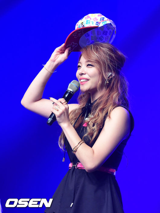에일리가 진행자 박성광에게 선물받은 모자를 착용하고 있다.