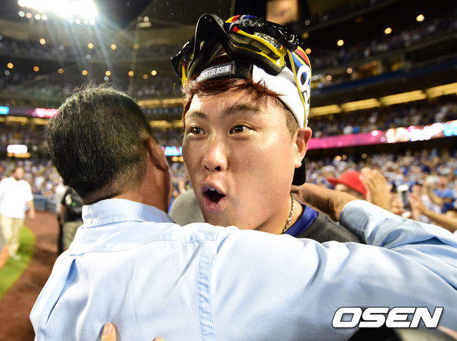류현진이 아버지 류재천씨와 포옹을 하며 우승을 기뻐하고 있다. /jpnews@osen.co.kr