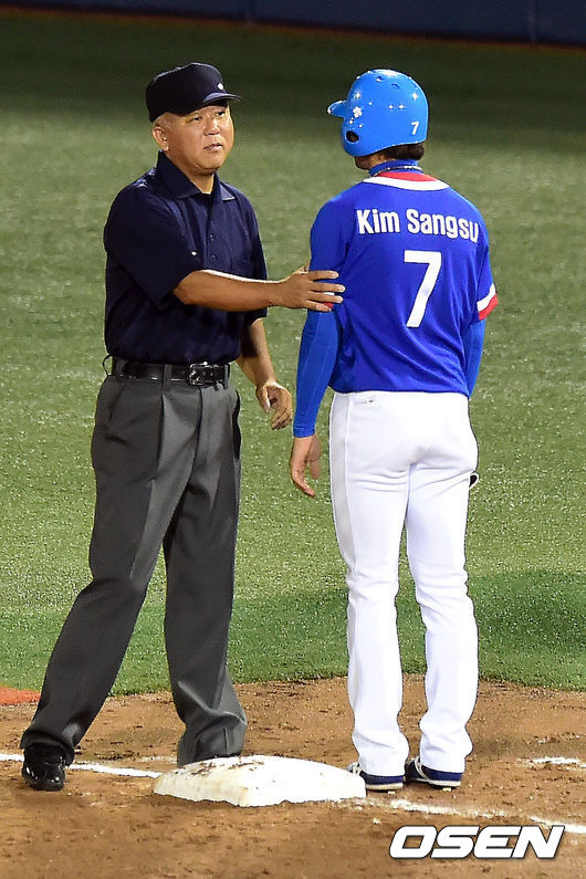 25일 서울 목동야구장에서 2014 인천 아시안게임 B조 예선 3차전 한국과 홍콩의 경기, 3회초 무사 1루 강정호의 볼넷 때 김상수가 대주자로 나갔다. 1루심이 김상수의 몸을 돌려 등번호를 확인시키고 있다.