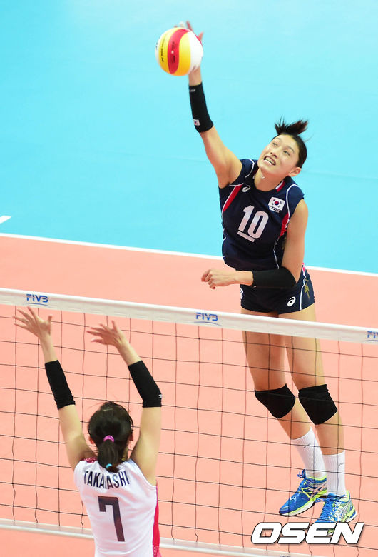 25일 오후 안산 상록수체육관에서 열린 2014 인천 아시안게임 배구 여자 예선 A조 3차전 한국과 일본의 경기 1세트, 김연경이 공격을 시도하고 있다.