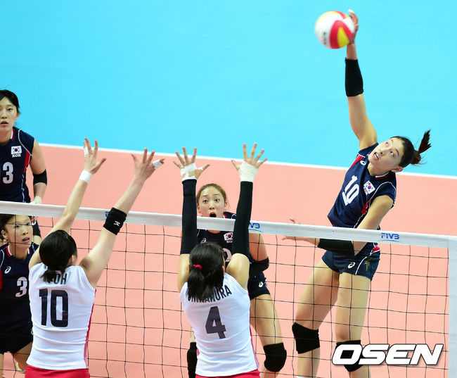 25일 오후 안산 상록수체육관에서 열린 2014 인천 아시안게임 배구 여자 예선 A조 3차전 한국과 일본의 경기 1세트 김연경이 공격을 시도하고 있다.