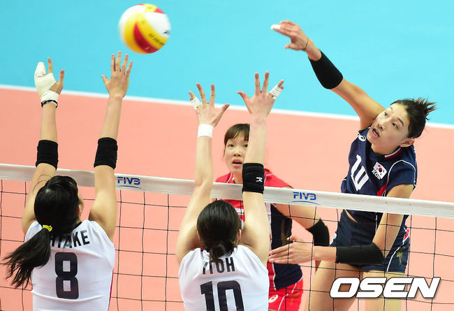 25일 오후 안산 상록수체육관에서 열린 2014 인천 아시안게임 배구 여자 예선 A조 3차전 한국과 일본의 경기 1세트 김연경이 공격을 시도하고 있다.