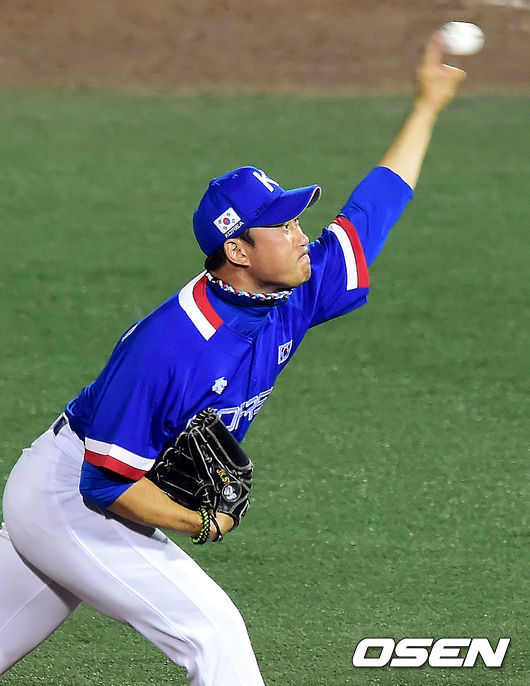 25일 서울 목동야구장에서 2014 인천 아시안게임 B조 예선 3차전 한국과 홍콩의 경기, 5회말 봉중근이 마운드에 올라 역투하고 있다.