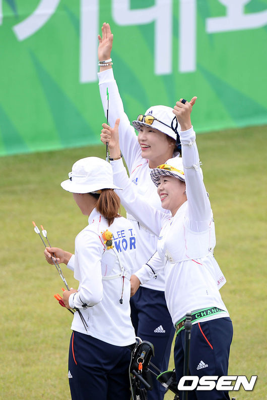 경기 종료 후 여자 리커브 대표팀이 환호하고 있다. /sunday@osen.co.kr