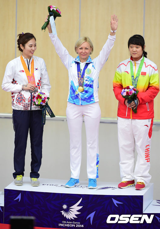 26일 오후 인천 옥련국제사격장에서 열린 2014 인천 아시안게임 사격 여자 50m 소총 3자세 개인전 시상식에서 카자흐스탄 도그건 올가가 두 팔을 번쩍 들고 있다.