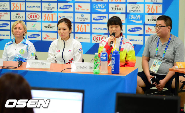 26일 오후 인천 옥련국제사격장에서 열린 2014 인천 아시안게임 사격 여자 50m 소총 3자세 개인전 메달리스트들의 기자회견에서 중국의 한 취재기자(오른쪽)가 동메달을 획득한 중국선수의 통역을 돕고 있다.