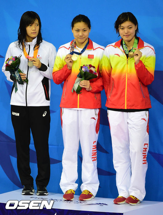 26일 오후 인천 문학박태환수영장에서 열린 2014 인천 아시안게임 수영 여자 자유형 50m 시상식에서 중국(금메달-동메달), 일본(은메달)선수들이 시상대에서 포즈를 취하고 있다.