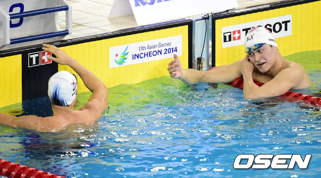 26일 오후 인천 문학박태환수영장에서 열린 2014 인천 아시안게임 수영 남자 자유형 1500m 결승에서 1위를 기록한 쑨양이 4위로 골인한 박태환에게 악수를 건내고 있다.
