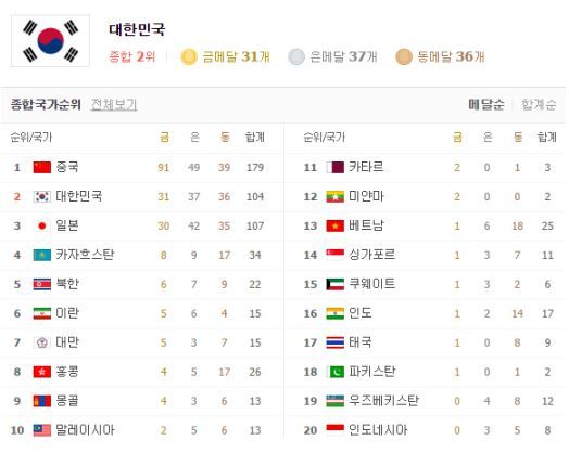 아시안게임 메달순위에 대해 네티즌들은 "아시안게임 메달순위, 다시 일본 제쳤구나" "아시안게임 메달순위, 2위 꼭 해야지" "아시안게임 메달순위, 중국은 힘들어도 일본은 이길 듯" 등의 반응을 보였다.