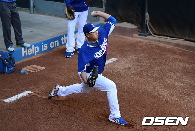 경기에 앞서 다저스 류현진이 불펜 피칭을 하고 있다.