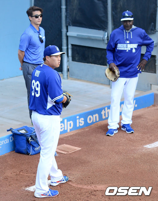 경기에 앞서 다저스 류현진이 불펜 피칭을 하고 있다.