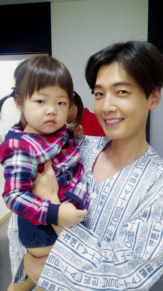 정경호는 27일 소속사를 통해 공개한 사진에서 촬영 의상인 환자복을 입고 다윤이를 안으며 다정한 모습을 연출하고 있다.