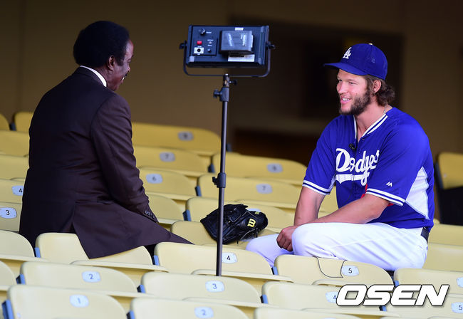 경기에 앞서 다저스 커쇼가 관중석에서 인터뷰를 하고 있다.