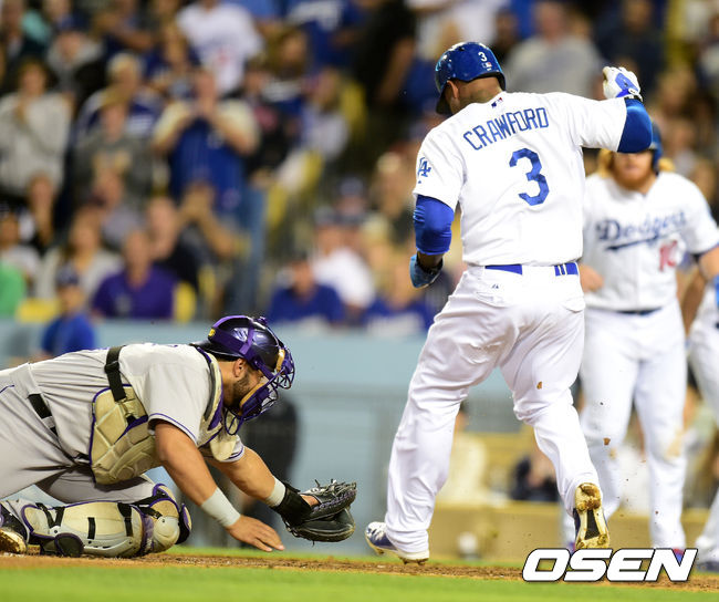 6회말 1사 만루에서 다저스 유리베의 2타점 적시타에 2루주자 크로포드에 홈에서 세이프되고 있다.