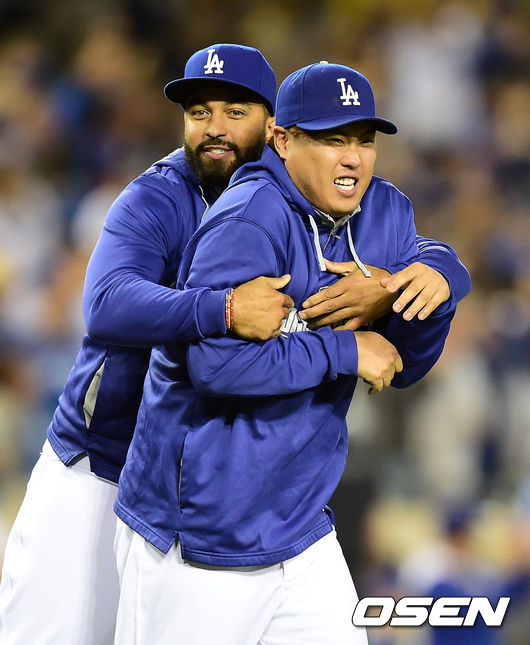 경기후 다저스 맷 켐프와 류현진이 장난을 치며 승리 하이파이브를 하기 위해 그라운드에 들어서고 있다. /jpnews@osen.co.kr