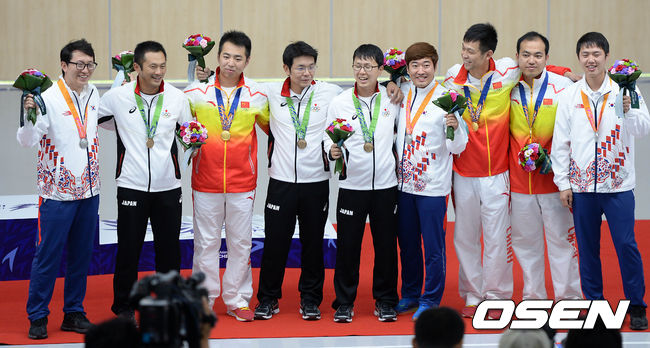 은메달을 목에 건 한진섭, 김종현, 권준철이 금메달 중국, 동메달 일본 선수들과 기념촬영을 하고 있다. /sunday@osen.co.kr